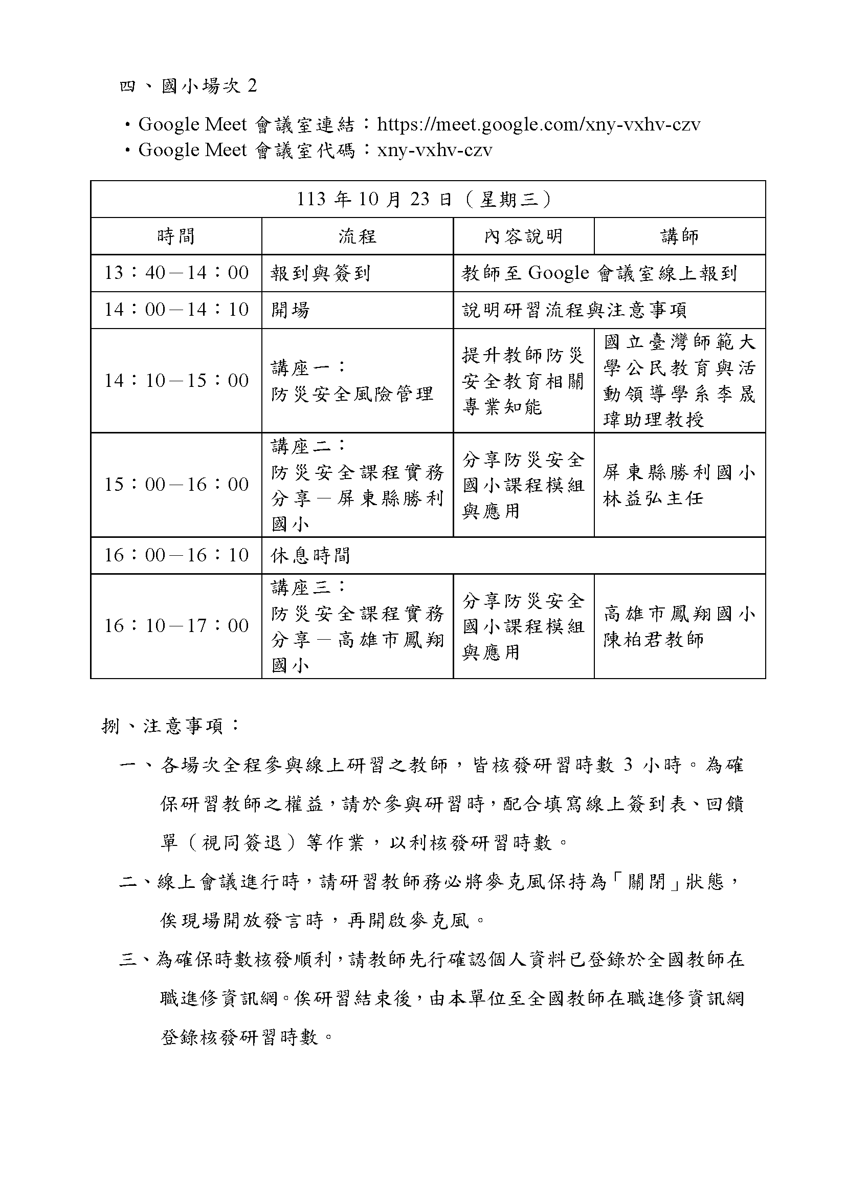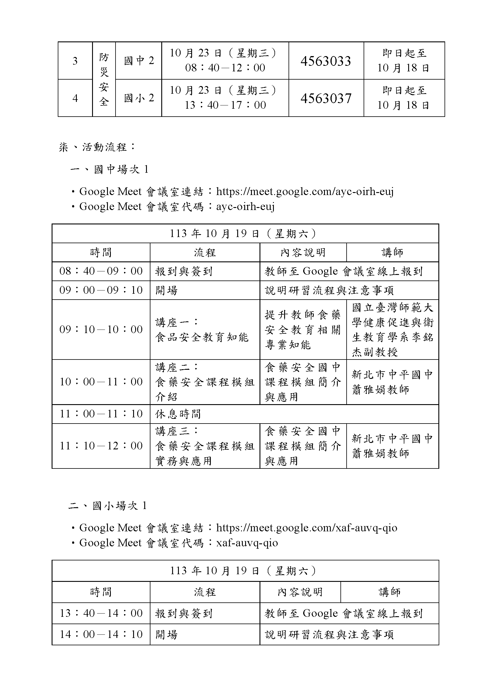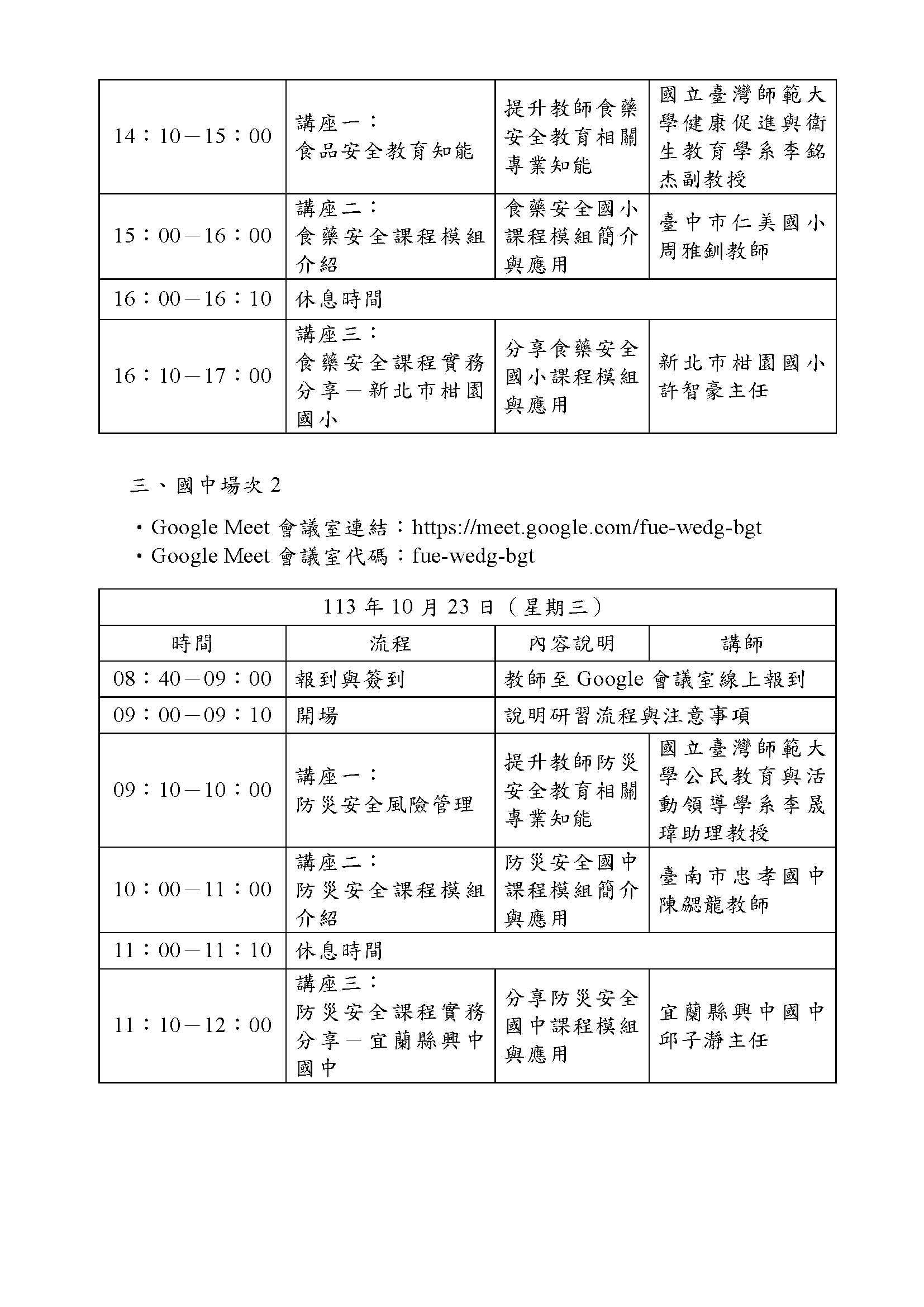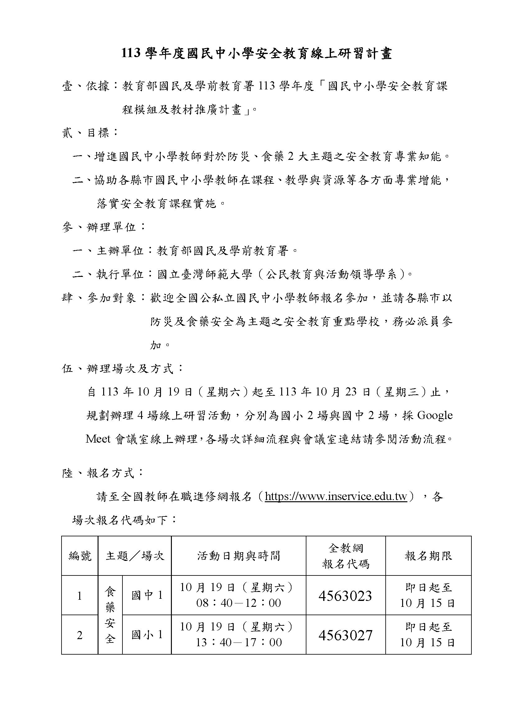為增進國民中小學教師對於防災、食藥2大主題之安全教育專業知能,落實安全教育課程實施,國教署委請國立臺灣師範大學於113學年度辦理4場次線上研習(國中及國小各2場次),說明如參考附件。