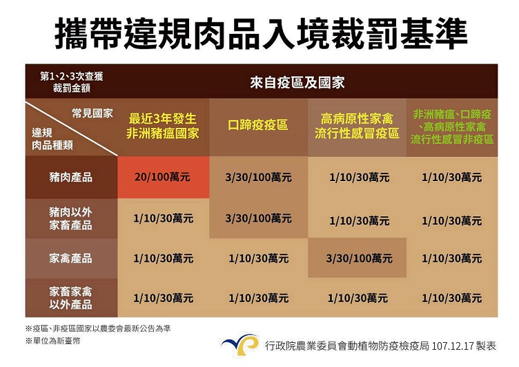 三、依據動物傳染病防治條例第45條之1規定及行政院農業委員會動植物防疫檢疫局107年12月18日公告的裁罰基準(如附件),旅客自近3年發生非洲豬瘟國家違規攜帶豬肉產品入境未申報檢疫者第1次處新臺幣(以下同)20萬元、第2次 處100萬元以下罰鍰,外籍人士不具居留證,第1次受罰20 萬元罰鍰且未能立即繳清者,拒絕其入境。
