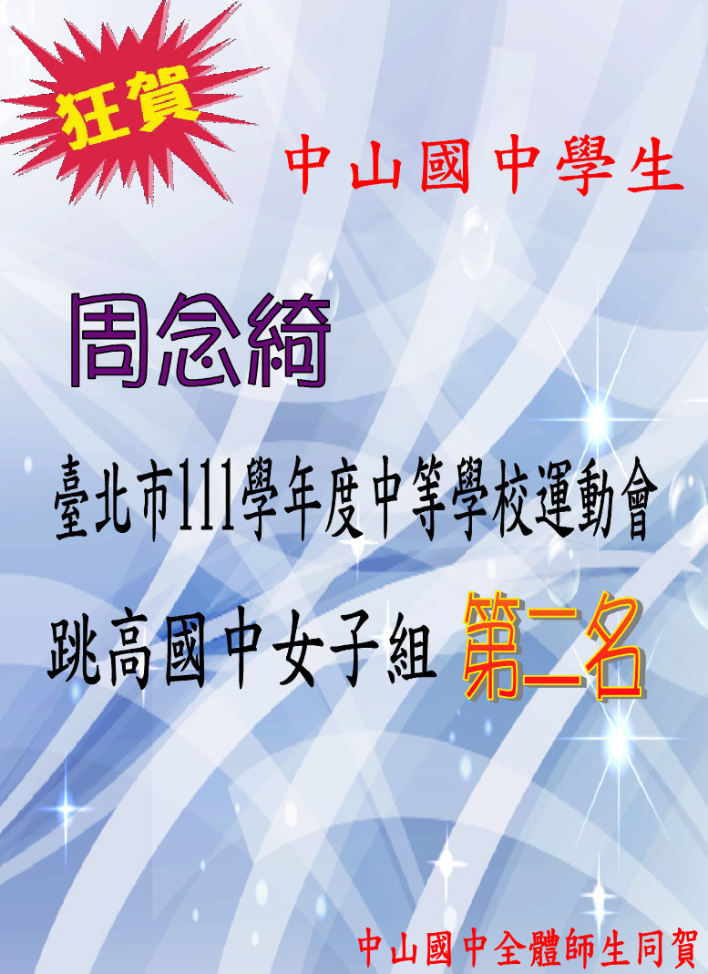 標題 恭喜中山國中學生周念綺榮獲臺北市111學年度中等學校運動會跳高國中女子組第2名