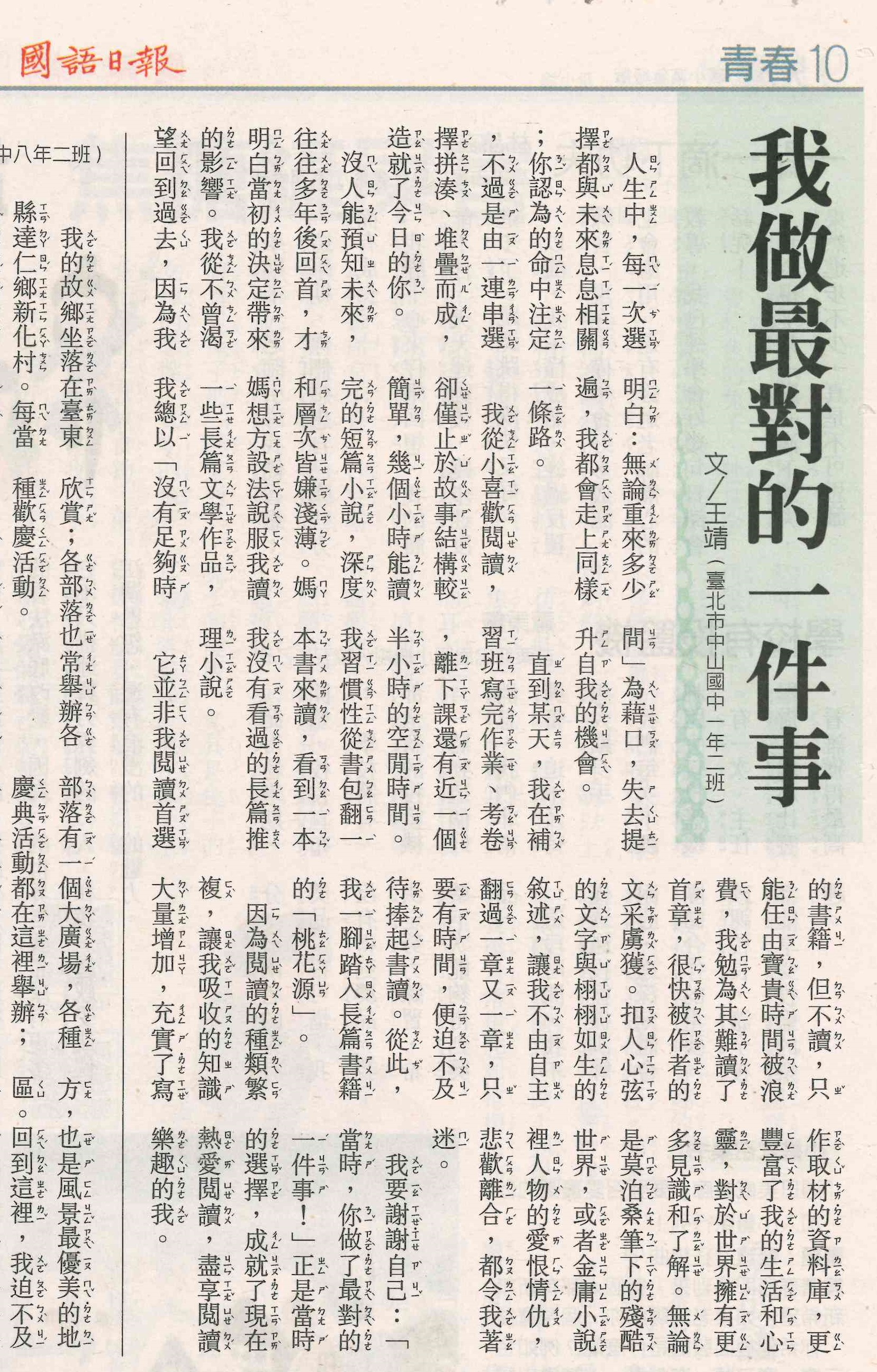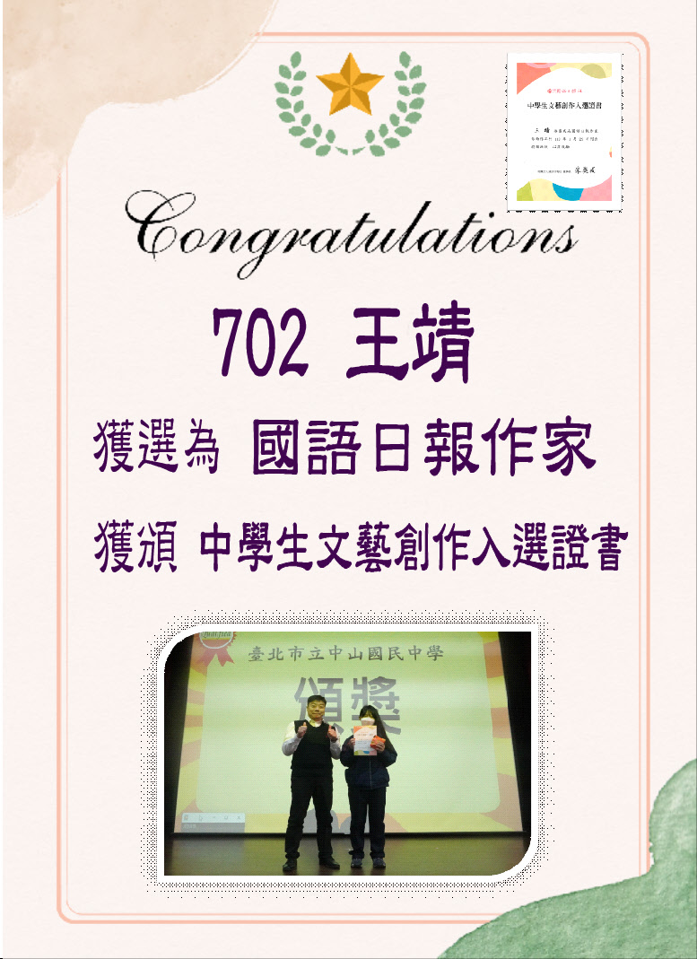標題 恭喜702王靖獲選為國語日報作家,獲頒「中學生文藝創作入選證書」