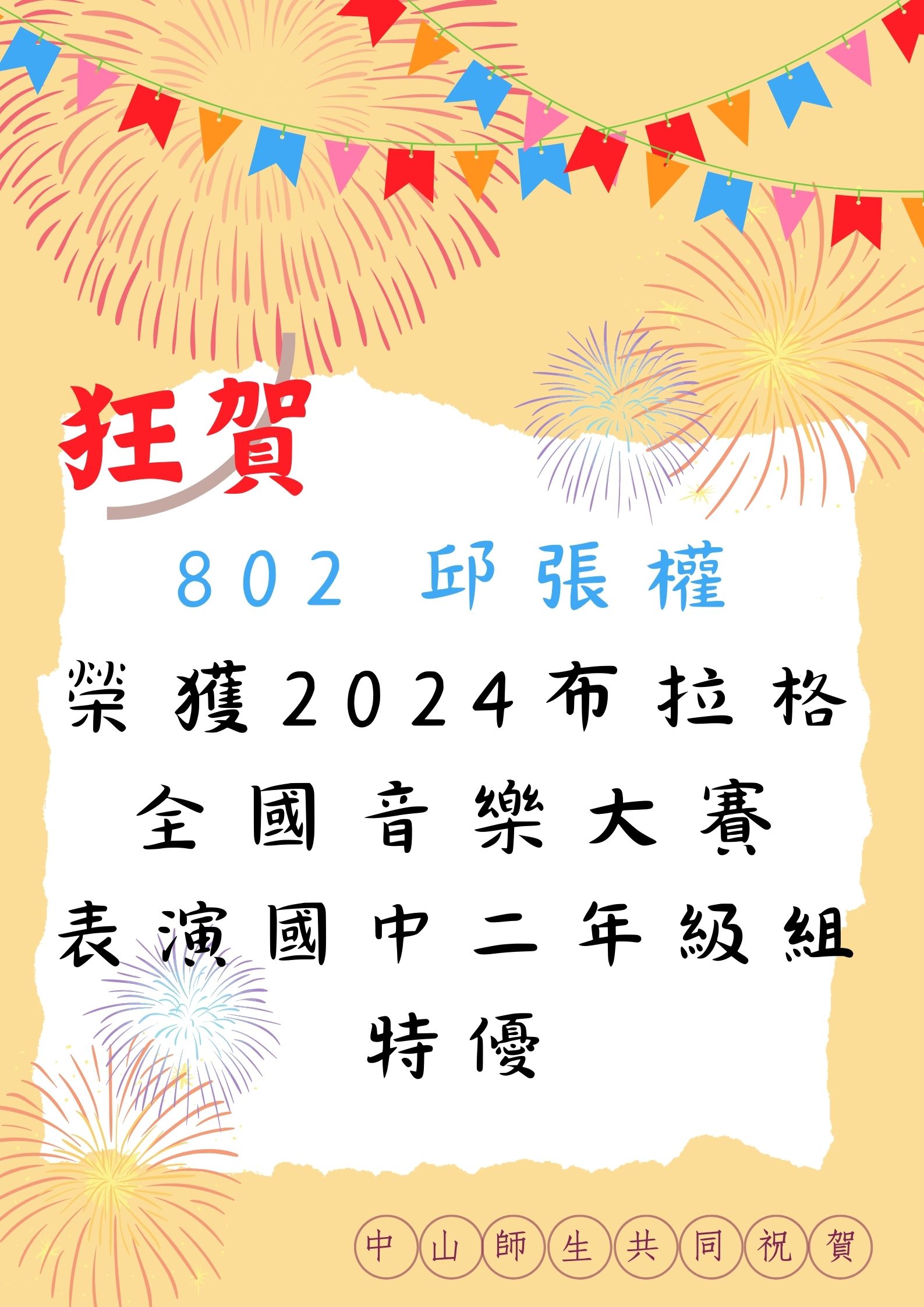 標題 賀802 邱張權榮獲2024布拉格全國音樂大賽表演國中二年級組特優