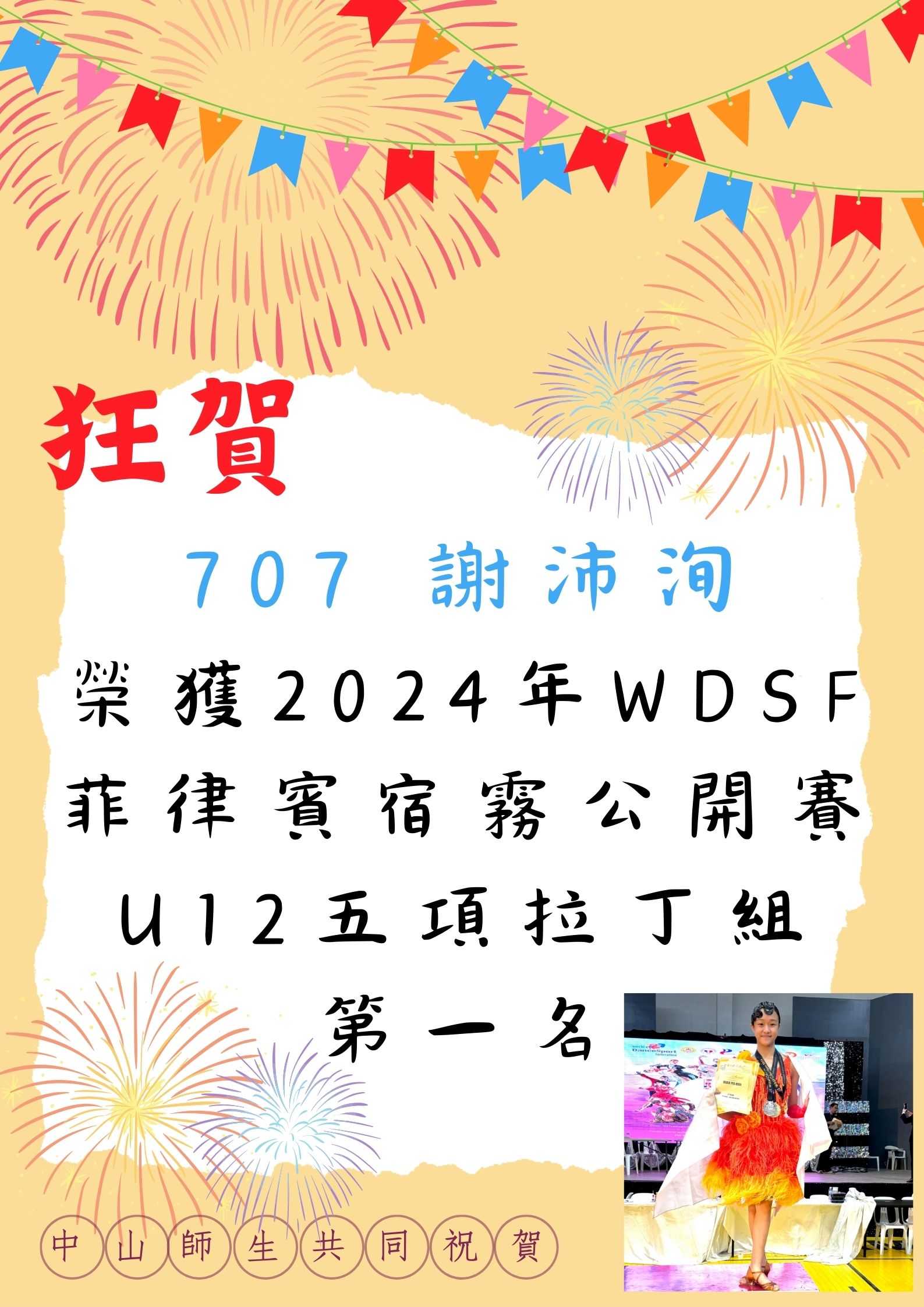 標題 賀707謝沛洵榮獲2024年WDSF菲律賓宿霧公開賽U12五項拉丁組第一名