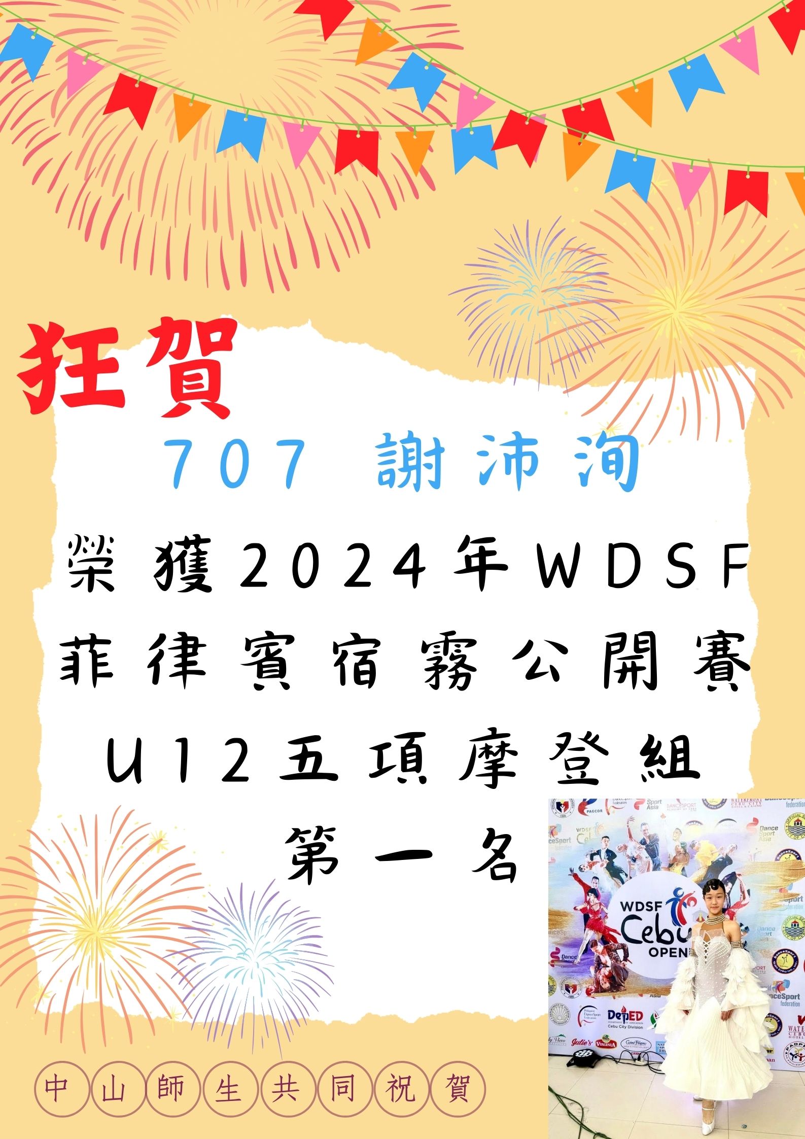 標題 賀707謝沛洵榮獲2024年WDSF菲律賓宿霧公開賽U12五項摩登組第一名