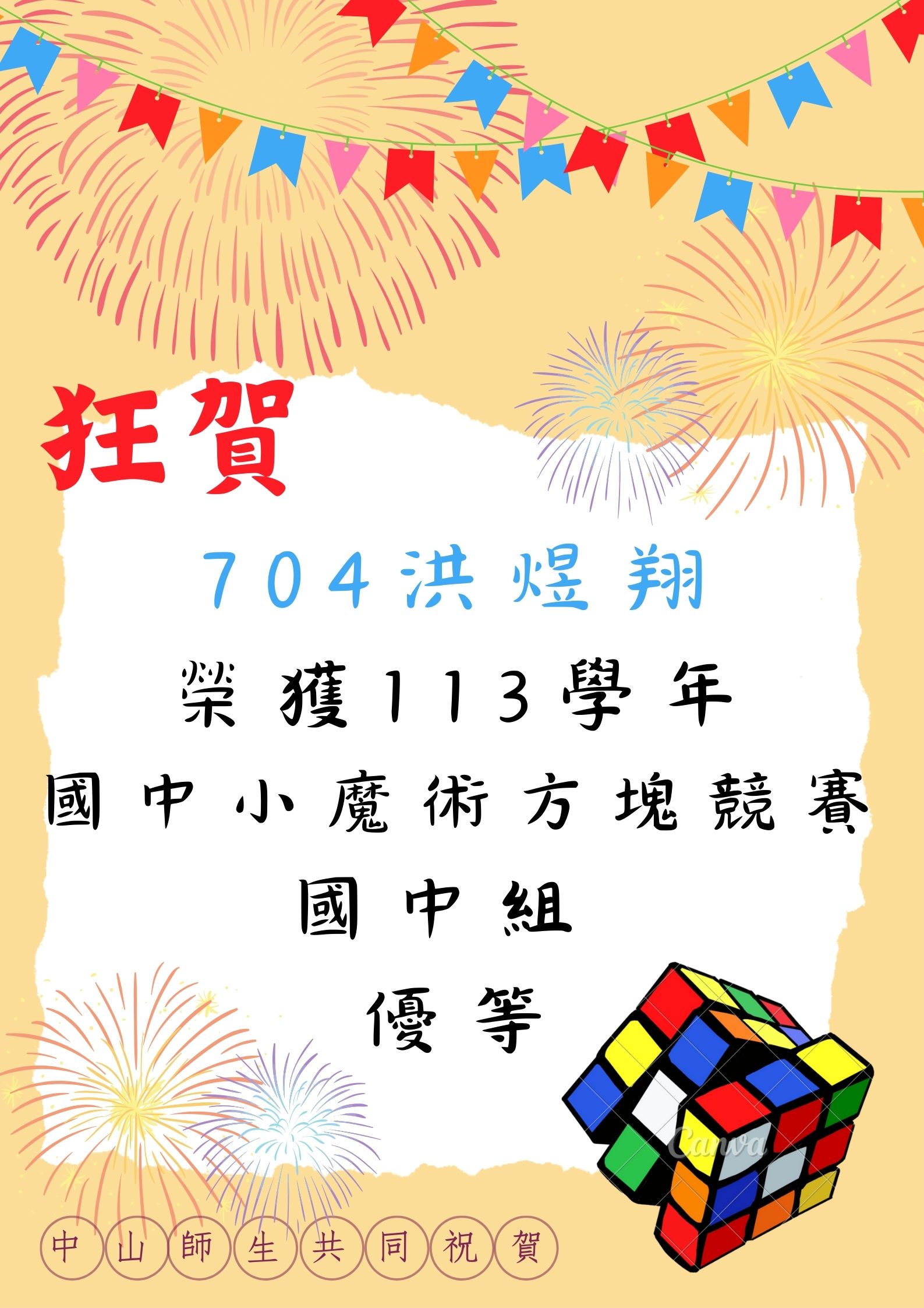 標題 賀704洪煜翔榮獲113學年國中小學魔術方塊競賽國中組優等