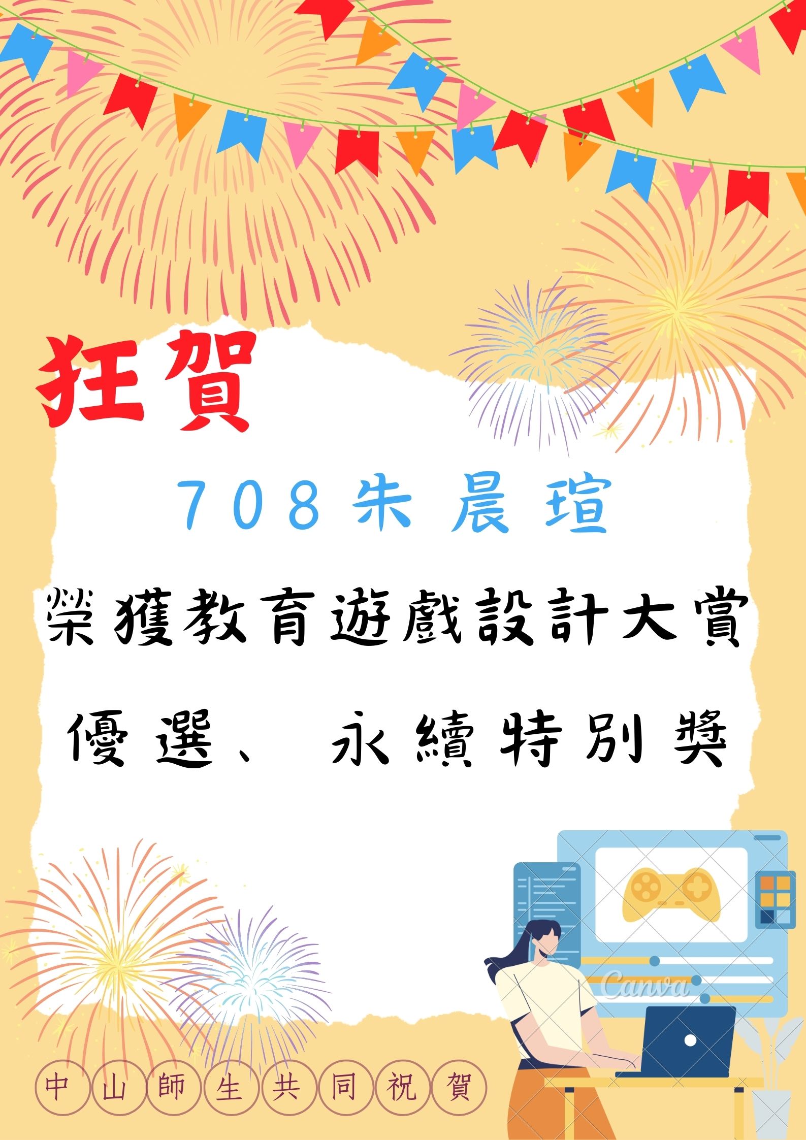 標題 賀708朱晨瑄榮獲教育遊戲設計大賞優選、永續特別獎