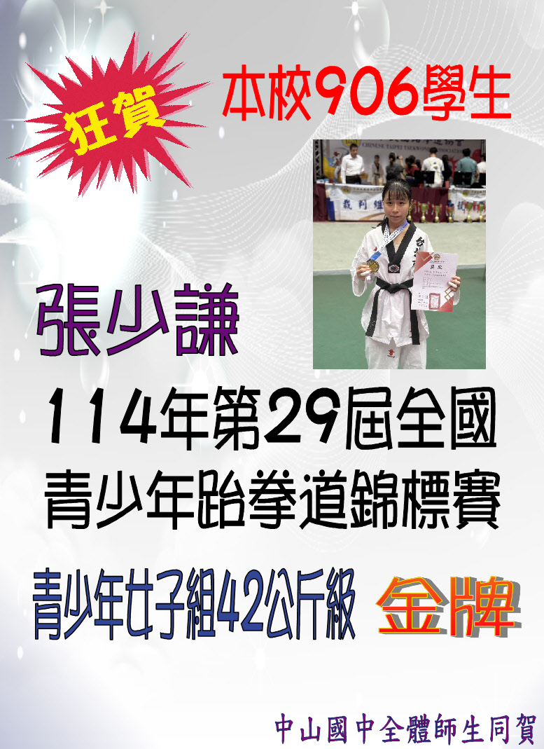 標題 恭喜906張少謙同學參加114年第二十九屆全國青少年跆拳道錦標賽榮獲 青少年女子組42公斤級 金牌