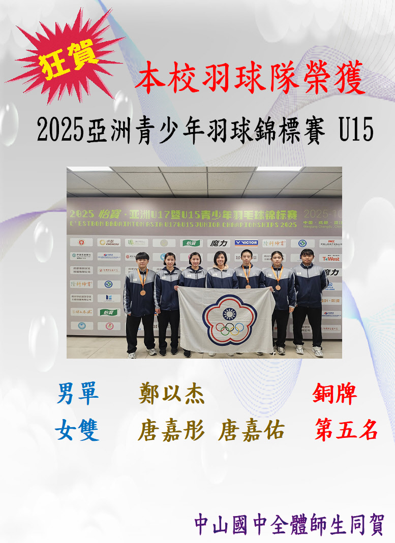 標題 狂賀!本校羽球隊選手代表中華台北參加2025亞洲青少年羽球錦標賽榮獲U15男單 鄭以杰 銅牌、女雙 唐嘉彤 唐嘉佑 第五名