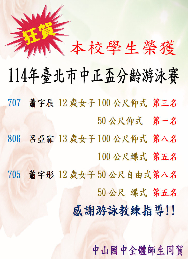 標題 狂賀!本校學生榮獲114年臺北市中正盃分齡游泳賽 707 蕭宇辰 12歲女子組 100公尺仰式 第3名、50公尺仰式 第1名; 806 呂亞霏 13歲女子組 100公尺仰式 第8名、100公尺蝶式 第5名; 705 蕭宇彤 12歲女子組 50公尺自由式第8名、50公尺 蝶式第5名,感謝游詠教練指導!!