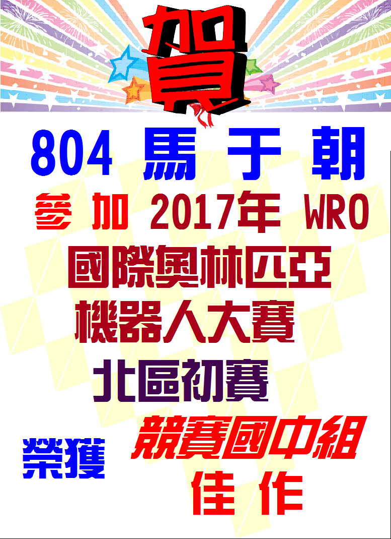標題 恭喜 804馬于朝同學參加「2017年WRO國際奧林匹亞機器人大賽北區初賽」,榮獲「競賽國中組 佳作」!