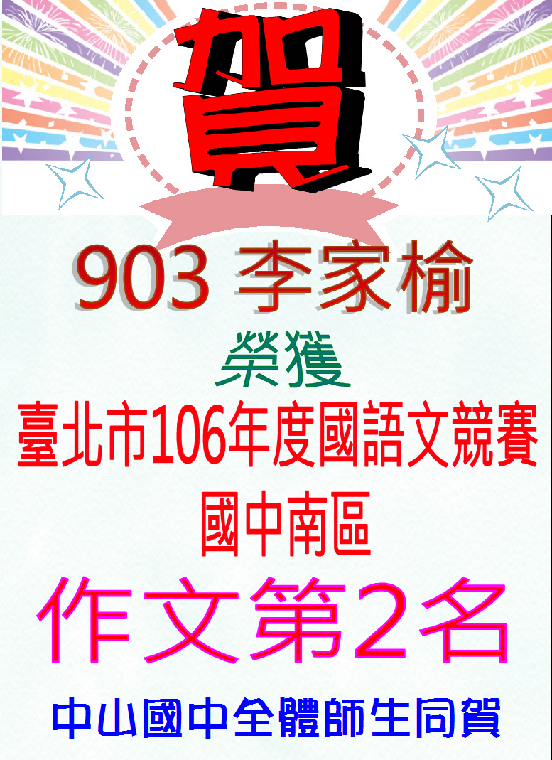 標題 恭喜!903李家榆同學,參加「臺北市106年度國語文競賽-國中南區組」,榮獲作文項目第2名!
