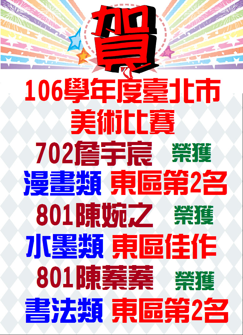 標題 賀!106學年度臺北市美術比賽,702詹宇宸榮獲漫畫類東區第2名,801陳婉之榮獲水墨類東區佳作,801陳蓁蓁榮獲書法類東區第2名!
