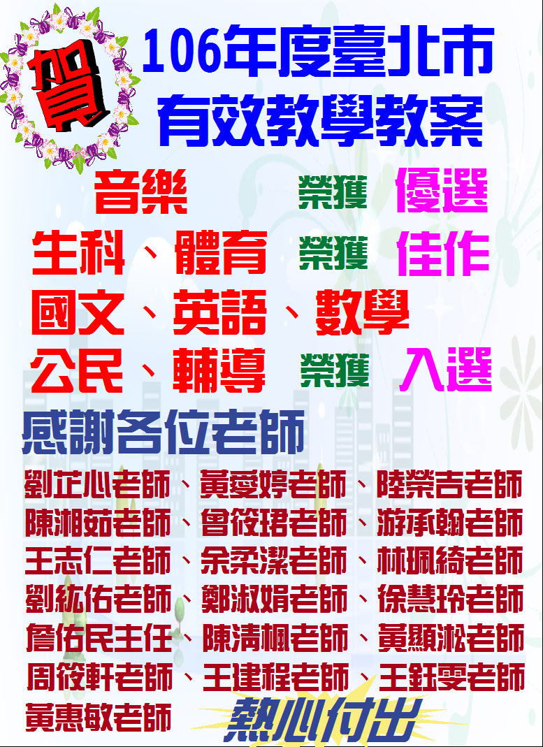 標題 賀!有效教學教案設計徵件比賽,音樂科榮獲優選,生活科技、體育榮獲佳作,國文、英語、數學、公民、輔導榮獲入選!感謝老師們熱心付出!