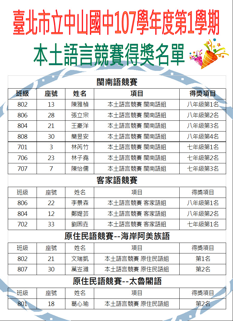 標題 107.1本土語言競賽得獎名單