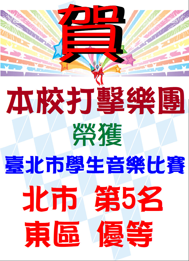 標題 恭喜本校打擊樂團,榮獲臺北市學生音樂比賽北市第5名、東區優等!