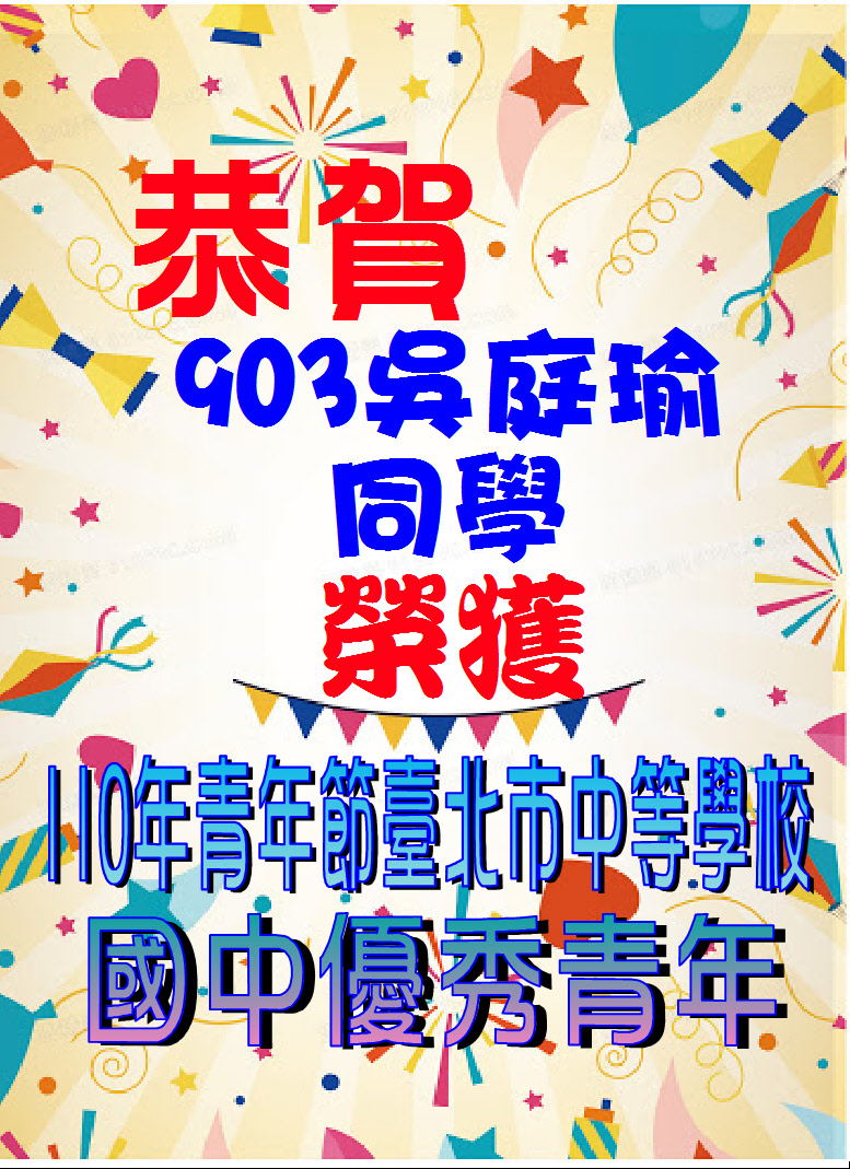 標題 恭喜中山國中903吳庭瑜同學榮獲110年青年節臺北市中等學校優秀青年